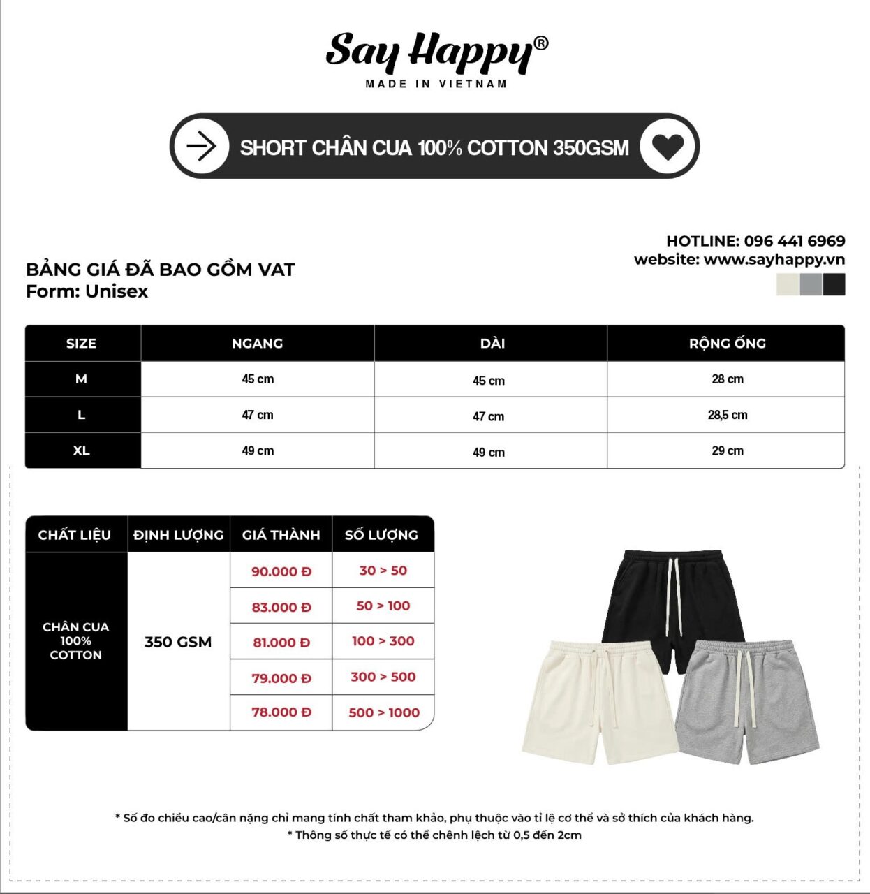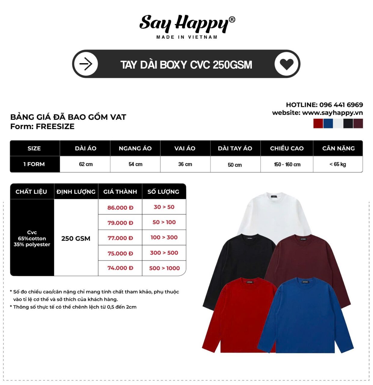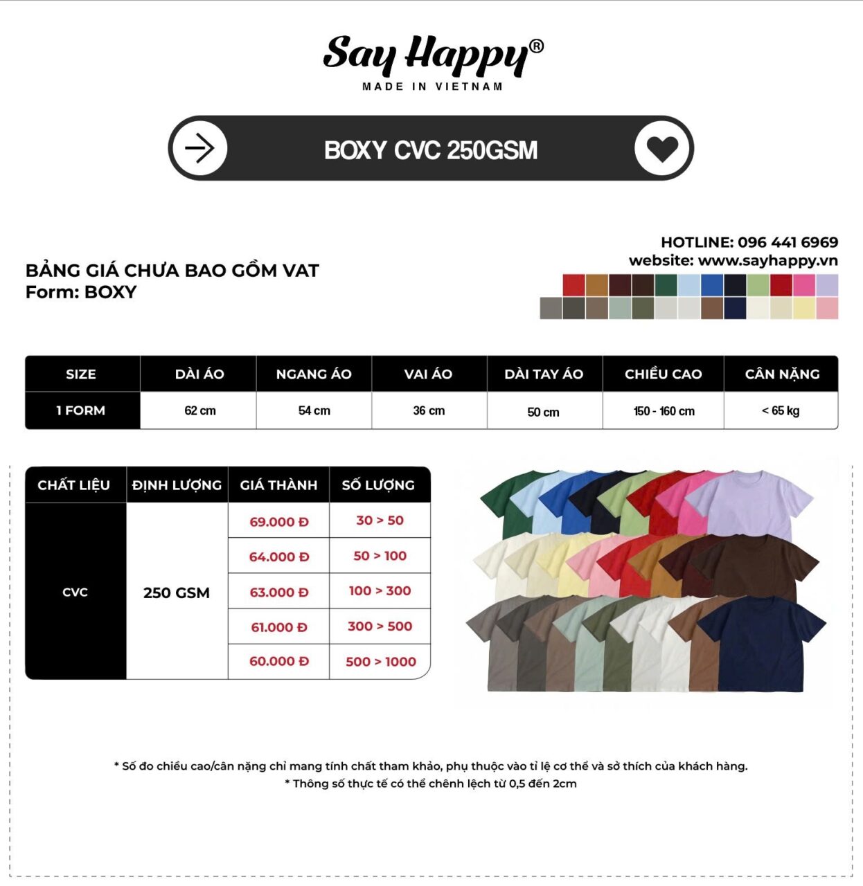 Bảng giá áo thun xưởng tại Say Happy được xây dựng dựa trên chất liệu vải, form dáng và số lượng đặt hàng. Với hơn 14 năm kinh nghiệm trong ngành may mặc, chúng tôi cung cấp giải pháp sản xuất áo thun tối ưu cho Local Brand, shop bán sỉ và các đơn hàng doanh nghiệp.