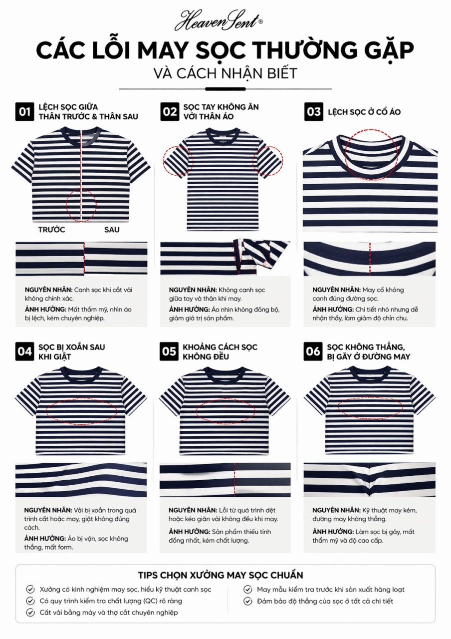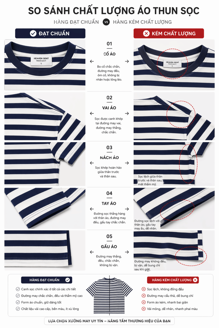 Nên chọn xưởng có kinh nghiệm sản xuất sọc, có hình ảnh sản phẩm thực tế và quy trình QC rõ ràng để đảm bảo độ chính xác khi canh sọc.